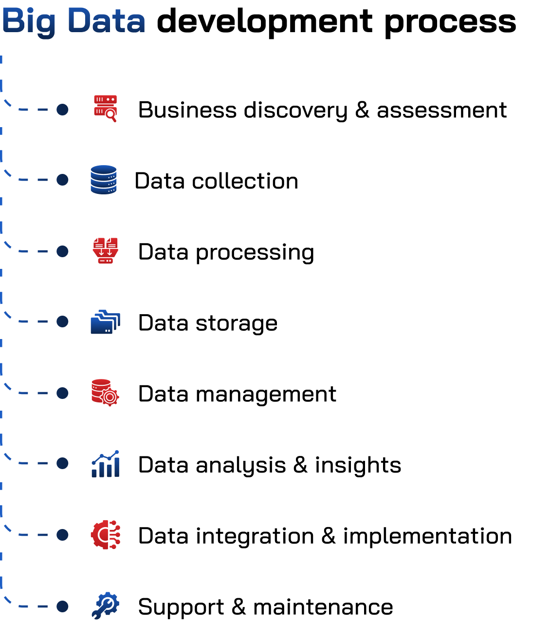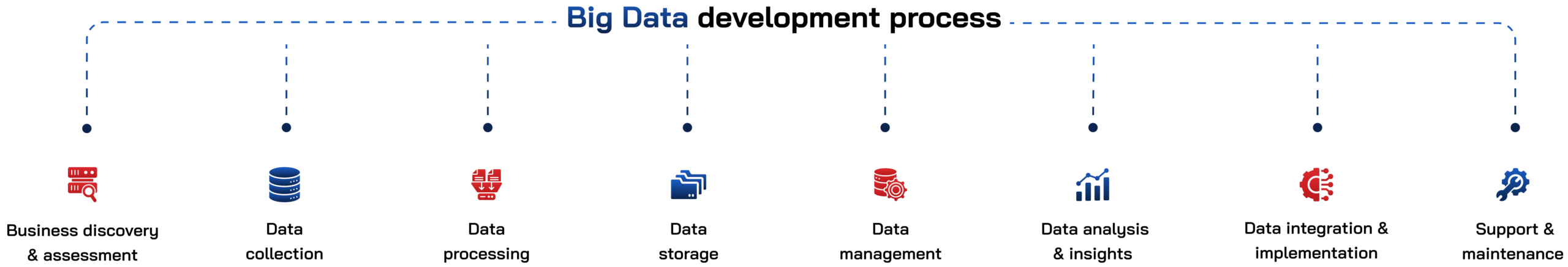 Our big data consulting services transform your data into a strategic advantage. Through comprehensive assessments and discovery sessions, we analyze your current landscape, identify gaps, and align capabilities with business objectives. Our data experts deliver a tailored roadmap that defines your data architecture, prioritizes initiatives, and provides clear implementation guidance to maximize value through effective governance and transformation strategies.