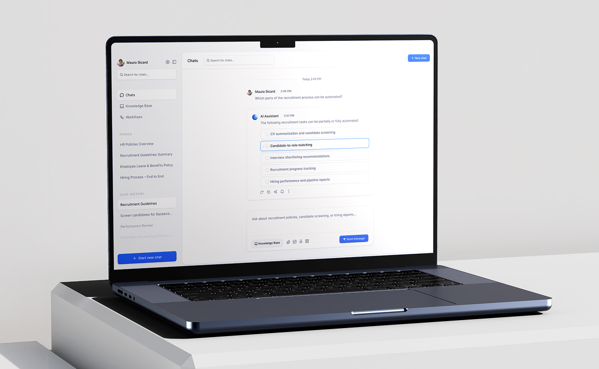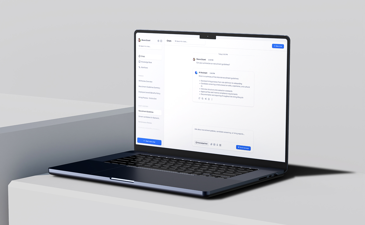 The client sought to transform internal productivity by introducing a secure, company-specific AI assistant capable of supporting employees across multiple workflows, from recruitment to reporting. They envisioned a chatbot similar to ChatGPT, but tailored to internal systems, documentation, and HR processes.